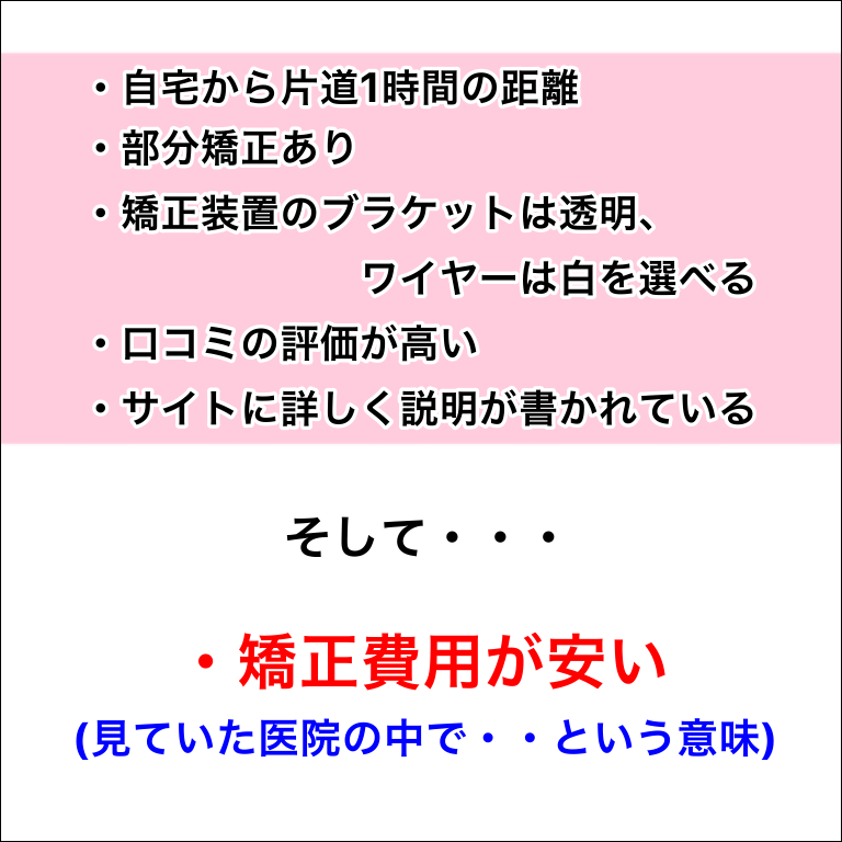 矯正は治療期間が長い。イコール歯科医院との付き合いも長くなるので「合わないな」と思うところに毎月通うのは苦痛だと思うので…