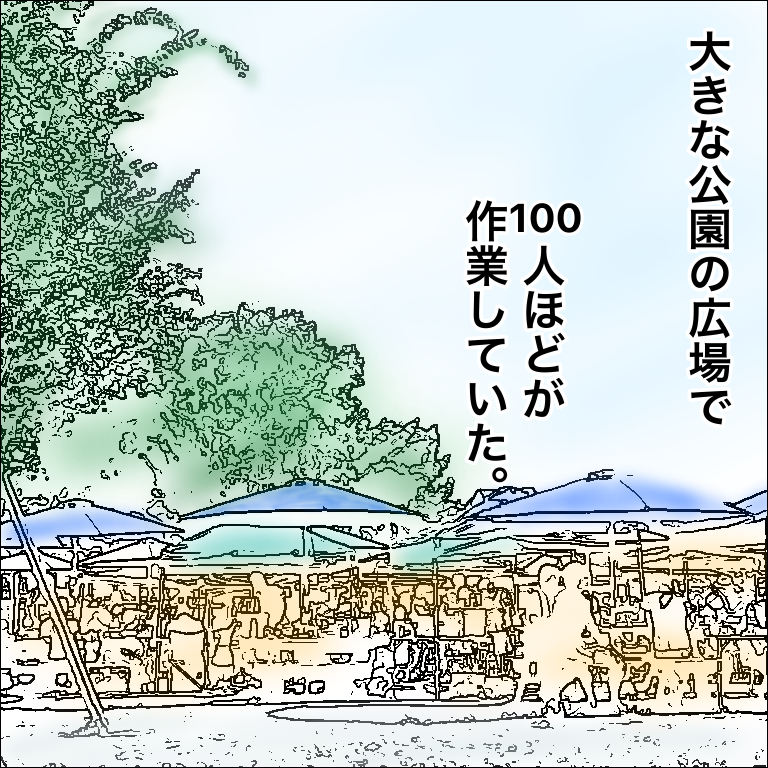 ボーリングの時にお世話になったCさんが公園の入り口で出迎えてくれ、案内された場所には100人ほどの人がテントを立てたりバーベキューの準備をしていました。