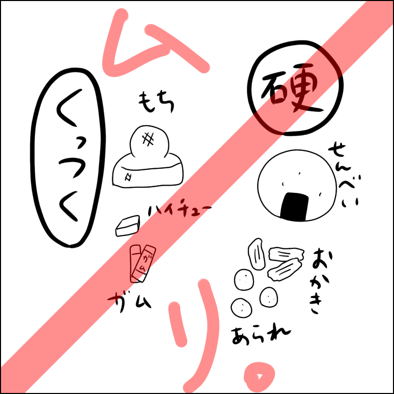 煎餅おかき、さきいかなどの噛みきりにくいものも✖️