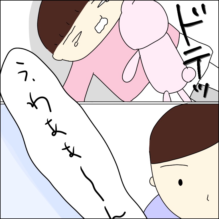 うさぎのぬいぐるみに抱きついたチカちゃんはバランスを崩して後ろに転んでしまう。