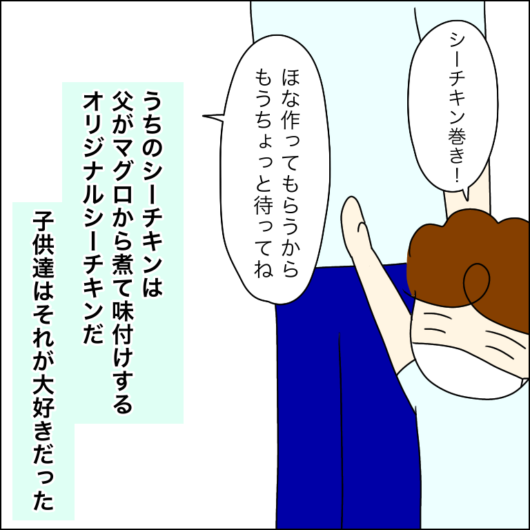 子供がオーダーした「シーチキン」はシーチキンの細巻き。マグロから味付けて作るのでうちオリジナルのシーチキンで私も大好きです。お客さんにもシーチキンファンがいて、私が学生の時に店に行くと5人前用の大きい桶にシーチキンの細巻きと軍艦がぎっしり入ったものを見たことがあり「シーチキンばっかやけど?」と聞くと「ここの高校生の息子さん、うちのシーチキン大好きや言うてこればっかり5人前食べるんよ」と……えー…