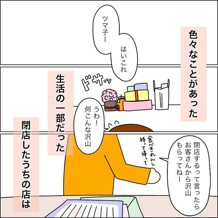 実家の寿司屋の話は思い出話としていつか描き残す予定でいたのですがまさかの急な閉店だったので、この気持ちを忘れないようにと急遽時系列で思い出話からスタートして現代の閉店まで描くことにしました。