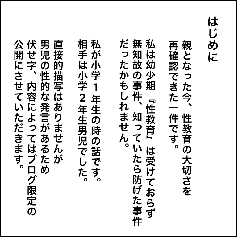 当時はこわい気持ち辛い気持ちも沢山しましたが、体験したからこそ親となった今子供への性教育の重要性を再確認できたと思っています。