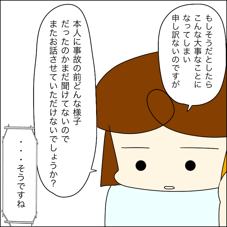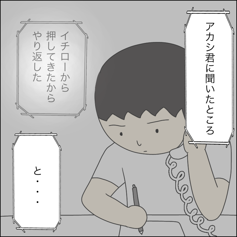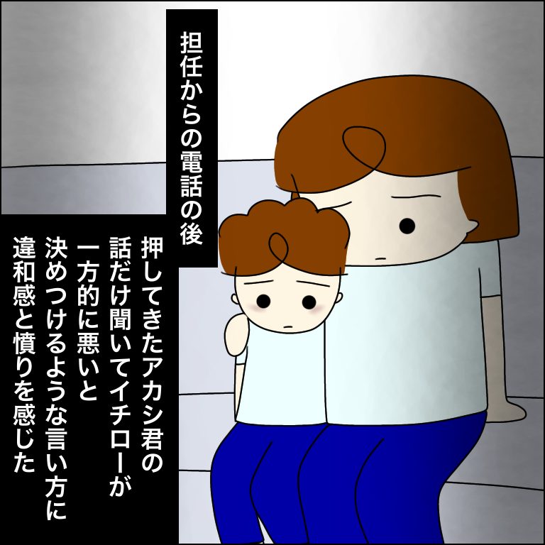 「我が子が悪いわけはない」とは思いませんが加害児童の話しか聞いていないのにイチローから仕掛けたのが原因だと決めつけるような言い方に違和感を覚えました。イチローからは事故が起きる前どういった経緯があってそうなったのかまだ話が聞けていない状態だったので。イチローから「何を」やってきたのかというのも聞けていませんでしたし、やり返すにしても車道に向かって押すということが危険行為だというのは全児童認識しないといけないんじゃないかなという思いでした。